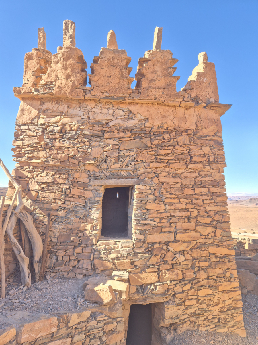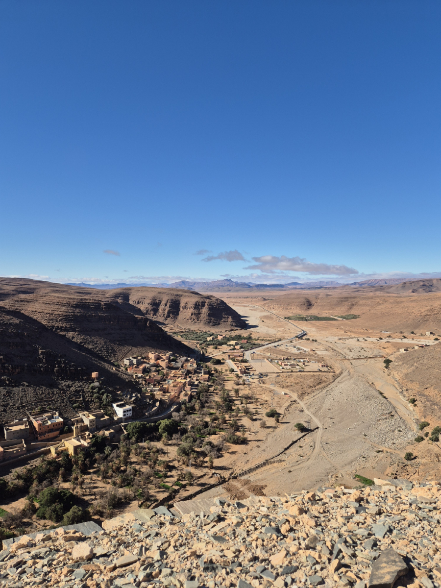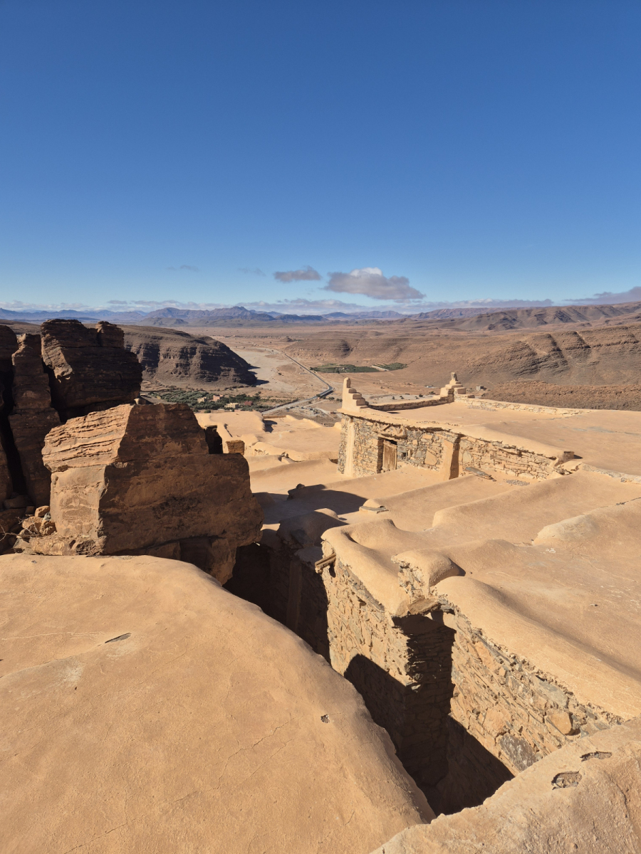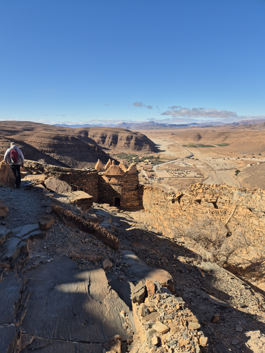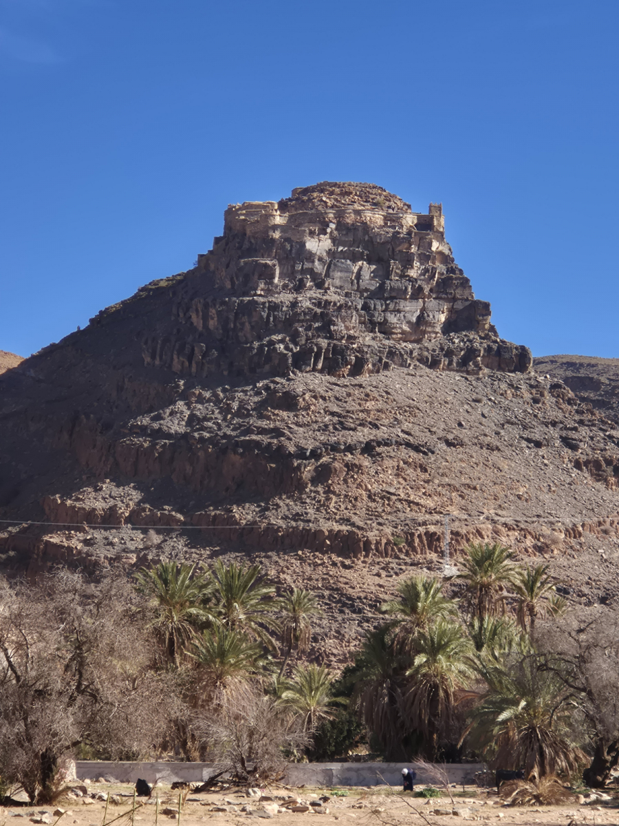 In einem der vorherigen Beiträge hatten wir schon mal kurz erwähnt, dass Agadir zwar eine Stadt in Marokko ist, aber das Wort eigentlich „befestigter Ort“ oder „Festung“ bedeutet. Historisch diente ein Agadir als Speicherfestung – ein gut gesichertes Lager für lebenswichtige Güter: Getreide, Olivenöl, Salz, Gewürze und manchmal auch Waffen. Im Falle eines Angriffs konnten die Anwohner sich selber und ihr Vieh ebenfalls in Sicherheit bringen. Der Agadir Id Aissa ist eine solche Speicherfestung und zwar eine sehr imposante. Er ist um die 800 Jahre alt, wurde aber 2007 restauriert und kann heute besichtigt werden. Zu Fuße des Agadirs liegt der Ort Amtoudi, die Straße dorthin ist eine Sackgasse. Es gibt einen Campingplatz, der vermutlich ausschließlich von den Touristen genutzt wird, die sich den Agadir anschauen wollen, bzw. in der naheliegenden Schlucht wandern wollen.