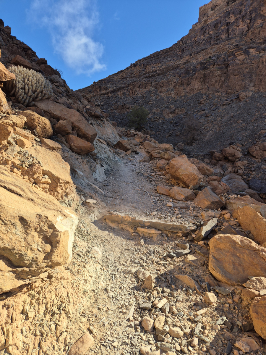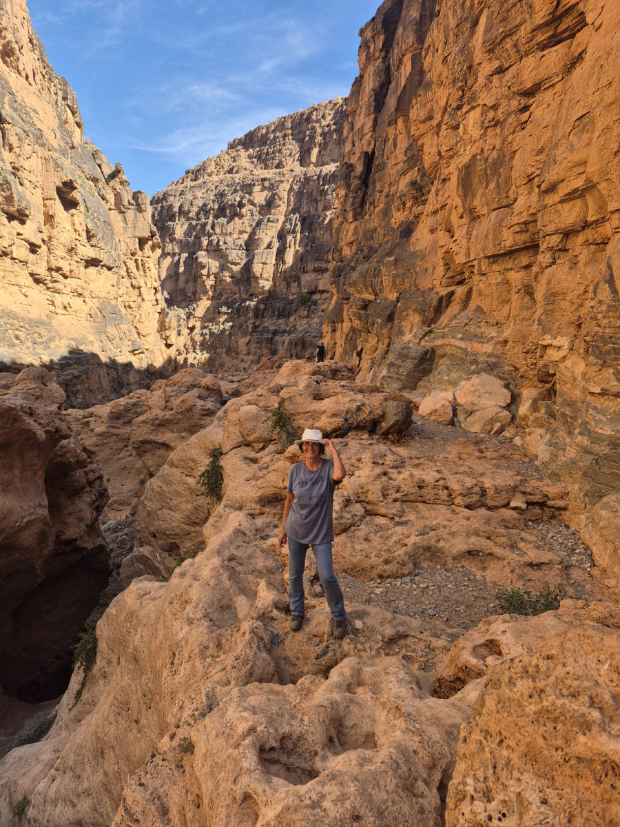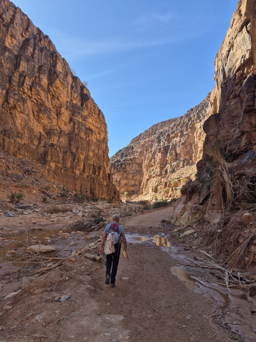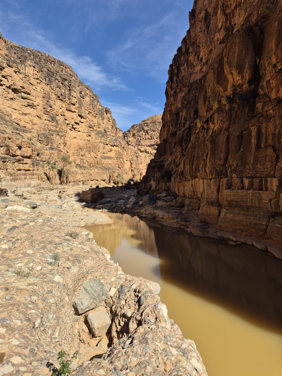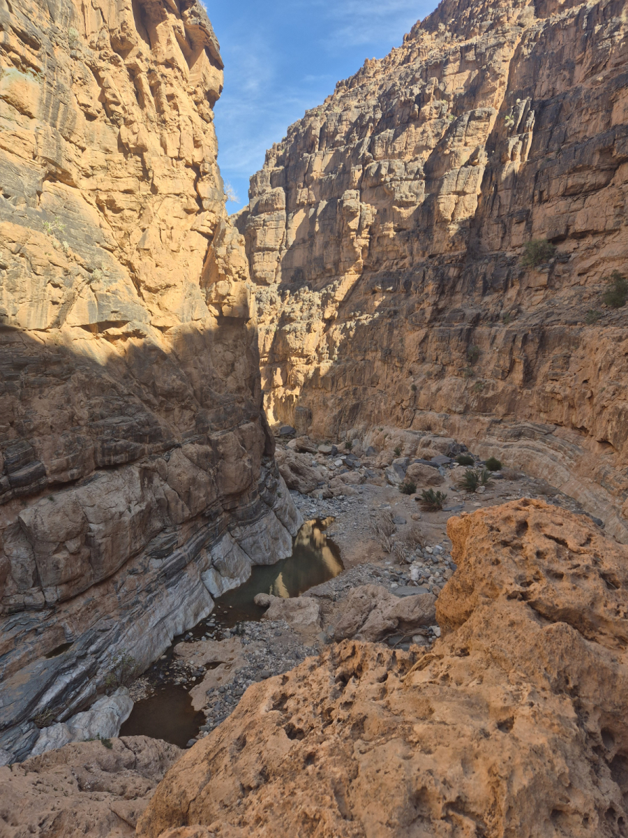 Eigentlich wollen wir am ersten Tag erst die Festung besteigen, doch am Morgen liegt das ganze Tal im Nebel. Wir sind uns nicht sicher, ob und wann sich der Nebel auflösen wird, daher beschließen wir zuerst die Schlucht zu durchwandern. Wir gehen zunächst durch den Ort, am Ende werden die Felswände enger und es gibt keine Häuser mehr. Wir folgen dem Flusslauf und sind mal wieder total begeistert von den steilen Wänden, die rechts und links nahezu senkrecht aufsteigen. Es geht über „Stock und Stein“ bis wir an einer Engstelle ankommen. Hier staut sich das Wasser und bildet kleine Tümpel. In diesen Tümpeln lebt ein kleine Fischart, die nur in diesen Tümpeln lebt. Wohl ein Überbleibsel aus der Zeit, als der Fluss ganzjährig und viel Wasser geführt hat.