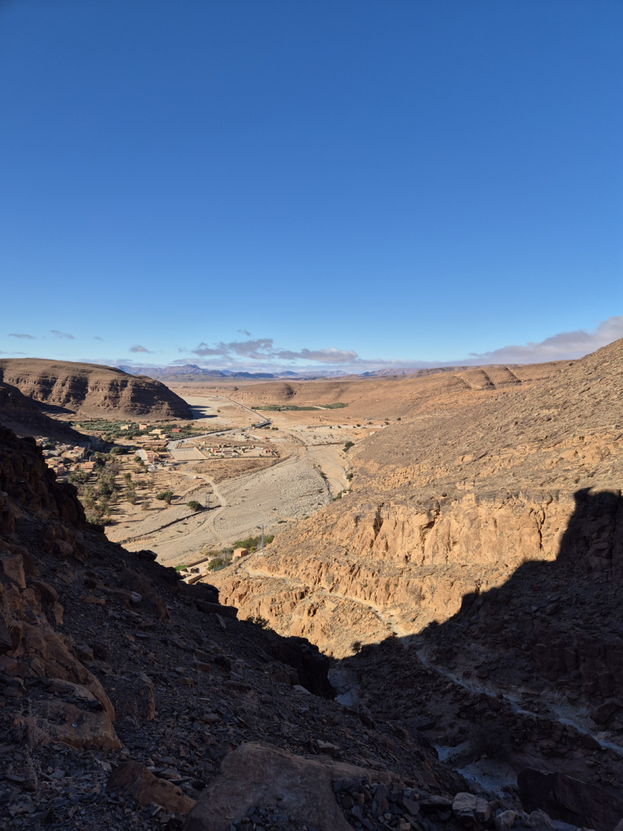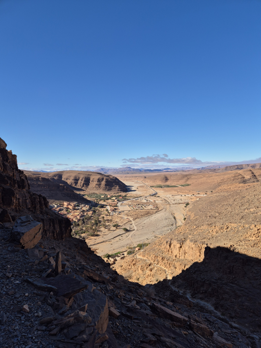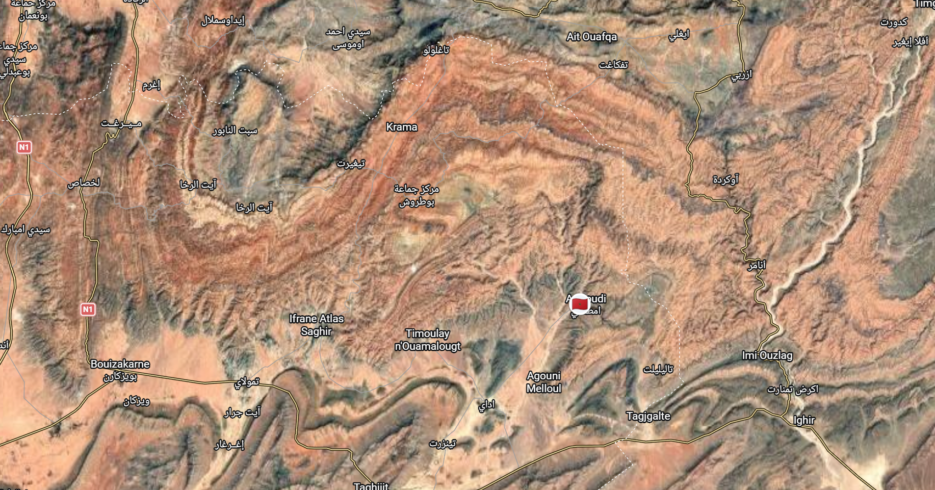 Der Ort liegt im westlichen Anti Atlasgebirge. Dieses google Maps Bild zeigt schon die beeindruckende Formation und Farben.