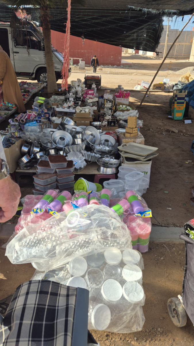 Der Ort selber ist vom Tourismus geprägt und zeigt sich so wie die meisten Orte am Meer, stark in die Jahre gekommene Uferpromenade, halb zerfallene Hotel- und Restaurant-Gebäude. Zwei drei Straßen von der Promenade weg beginnt dann das normale marokkanische Leben. Hier verbringen die Bewohner, in für uns Westeuropäer schwierig zu verstehenden Umständen ihr normales Leben. Wir besuchen den Wochenmarkt, der sich hier eine breite Straße entlang ausbreitet. Ähnlich wie schon in Sidi Ifni, interessant anzusehen. Wir kaufen in der bereits beschriebenen Manier frisches Obst und Gemüse ein.