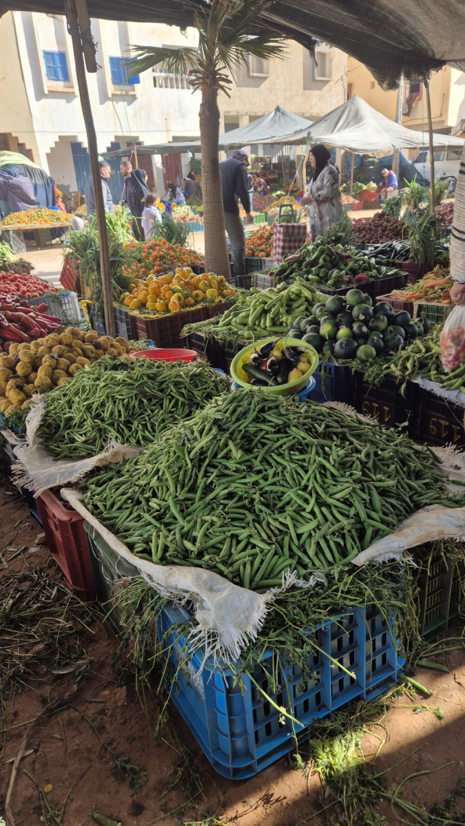 Der Ort selber ist vom Tourismus geprägt und zeigt sich so wie die meisten Orte am Meer, stark in die Jahre gekommene Uferpromenade, halb zerfallene Hotel- und Restaurant-Gebäude. Zwei drei Straßen von der Promenade weg beginnt dann das normale marokkanische Leben. Hier verbringen die Bewohner, in für uns Westeuropäer schwierig zu verstehenden Umständen ihr normales Leben. Wir besuchen den Wochenmarkt, der sich hier eine breite Straße entlang ausbreitet. Ähnlich wie schon in Sidi Ifni, interessant anzusehen. Wir kaufen in der bereits beschriebenen Manier frisches Obst und Gemüse ein.