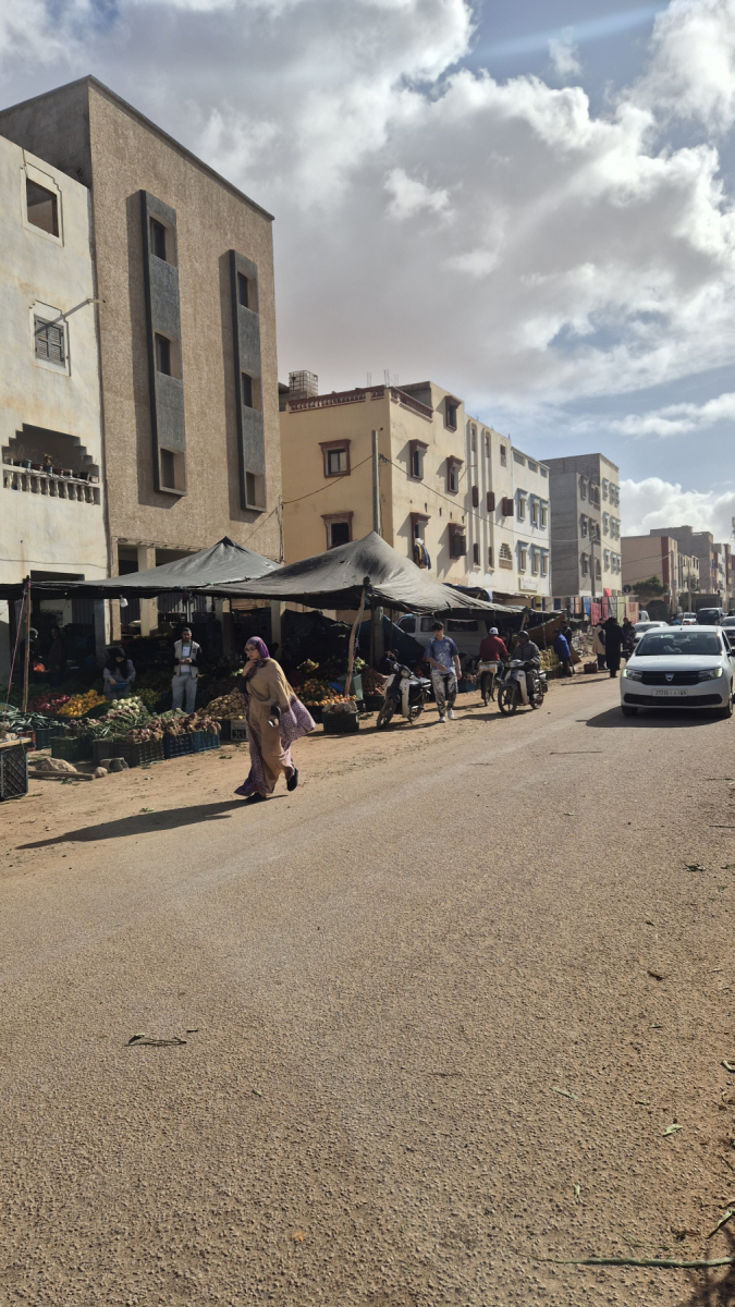 Der Ort selber ist vom Tourismus geprägt und zeigt sich so wie die meisten Orte am Meer, stark in die Jahre gekommene Uferpromenade, halb zerfallene Hotel- und Restaurant-Gebäude. Zwei drei Straßen von der Promenade weg beginnt dann das normale marokkanische Leben. Hier verbringen die Bewohner, in für uns Westeuropäer schwierig zu verstehenden Umständen ihr normales Leben. Wir besuchen den Wochenmarkt, der sich hier eine breite Straße entlang ausbreitet. Ähnlich wie schon in Sidi Ifni, interessant anzusehen. Wir kaufen in der bereits beschriebenen Manier frisches Obst und Gemüse ein.