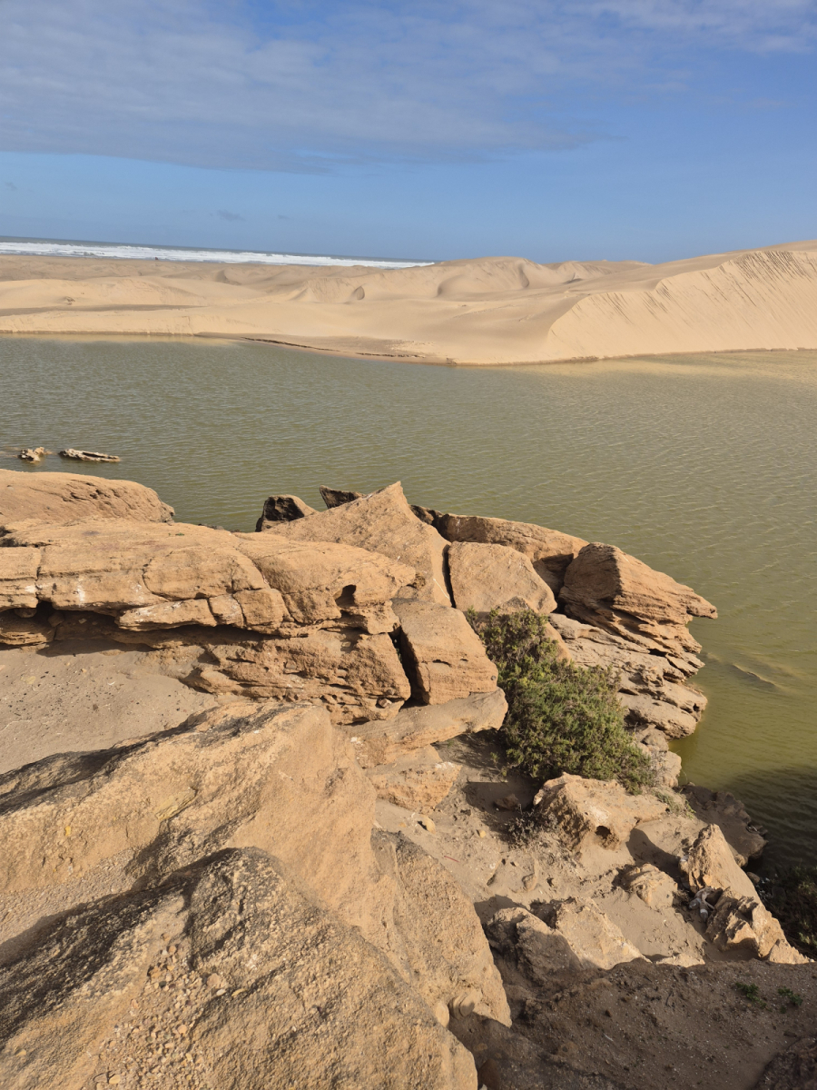 Nördlich von El Ouatia mündet der Wadi Draa in den Atlantik (Wadi steht für einen Flusslauf, der nur gelegentlich Wasser führt). Die Mündung des Draa soll sehr beeindruckend sein und deshalb machen wir einen Ausflug dorthin. Die Fahrt führt uns entlang der Küste durch die Wüstenlandschaft, vorbei an einem ehemaligen Fahrerlager aus der Zeit der Rally Paris Dakkar, hin zur Mündung. Stellenweise wird die Straße von einer Art Wanderdüne überdeckt, gar nicht so einfach die mit dem Moped zu überqueren. Das Delta des Draa ist wirklich sehr beeindruckend.