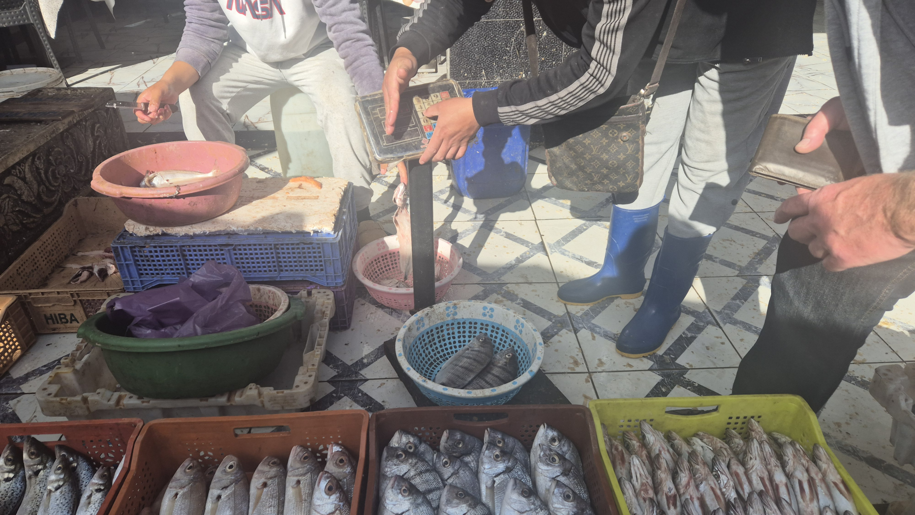Er zeigt mir den Preis auf seiner Waage