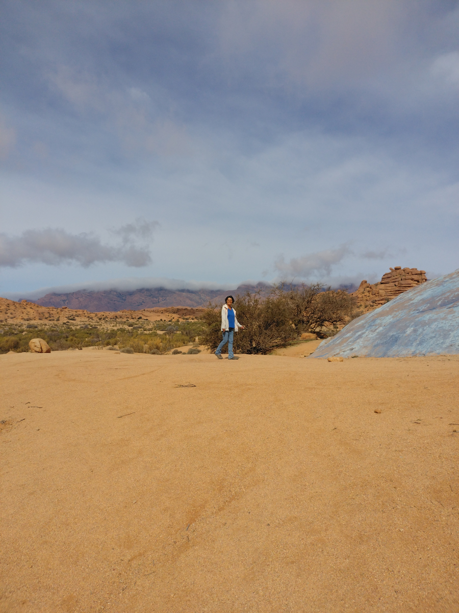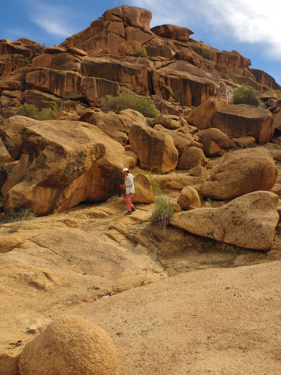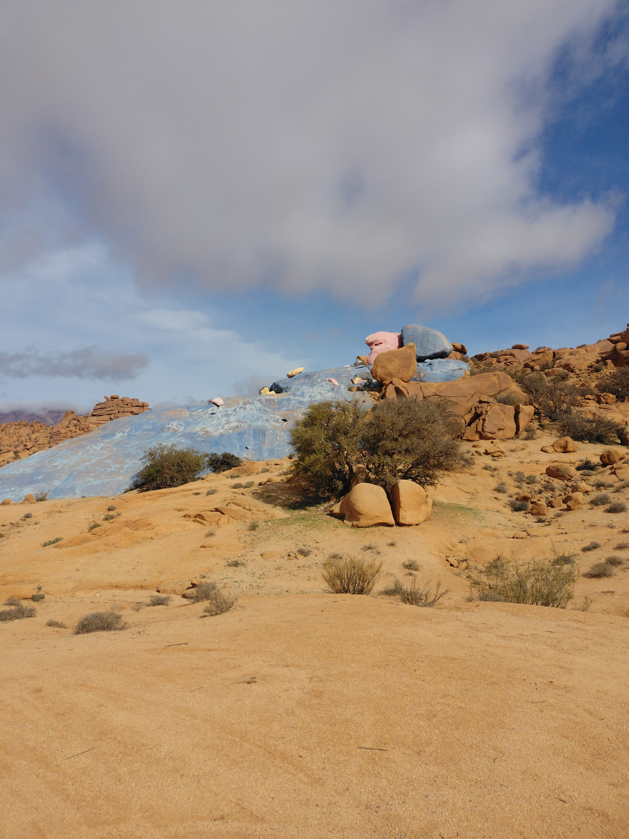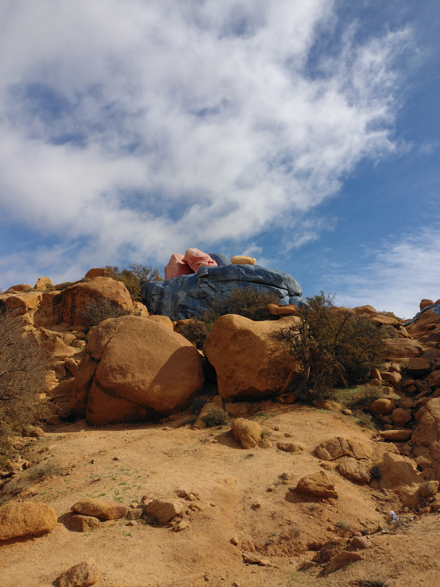 Wie oben schon beschrieben, haben sich in dem Tal von Tafraoute diese skurrilen Felsformationen gebildet. Heute wollen wir eine Wanderung zu den blauen Felsen von Tafraoute machen. Diese sind ein faszinierendes Kunstwerk des belgischen Künstlers Jean Vérame, der 1984 in der Nähe von Tafraoute einige Granitfelsen angemalt hat. Der Weg führt uns durch die Felslandschaft über einen Sattel in eine Ebene. Schon von weitem können wir die farbigen Felsen erkennen. Dort angekommen sind wir stark beeindruckt. die Farbe Blau hat in Marokko besondere Bedeutung. So malen z.B. viele ihre Häuser mit blauer Farbe an, weil das die Häuser (im spirituellen Sinn) schützen soll. Übrigens kann man die Steine in Google Maps mit der Satelliten-Ebene aus dem Weltall sehen.