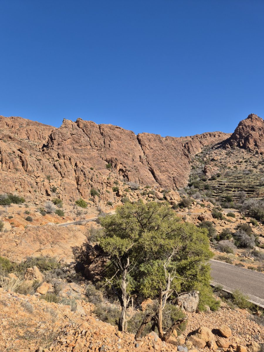 Aoukerda ist eine Schlucht, die auch als der Grand Canyon von Marokko bezeichnet wird. Wir fahren mit dem Moped Richtung Süden und biegen in eine kleine Straße ein. Die führt uns in ein Tal, dass der Fluss wohl über Millionen Jahre in den roten Fels geschnitten hat. Es ist eine sehr kurvige Strecke durch eine unwirkliche Landschaft. Sie führt uns auch in eine Sackgasse, an deren Ende ein kleines Dorf liegt. Bevor wir es allerdings erreichen, halten wir am „La Fenêtre de la Vie“, dem Fenster des Lebens. Das ist ein fast quadratischer Einschnitt in den Fels. Die Natur hat dort einen schmalen Felsstreifen gebildet, ähnlich einer Haarnadelkurve und der Einschnitt geht komplett durch den Felsstreifen und bildet dadurch ein Fenster. Extrem beeindruckend. Hoffentlich geben unsere Fotos das wieder.