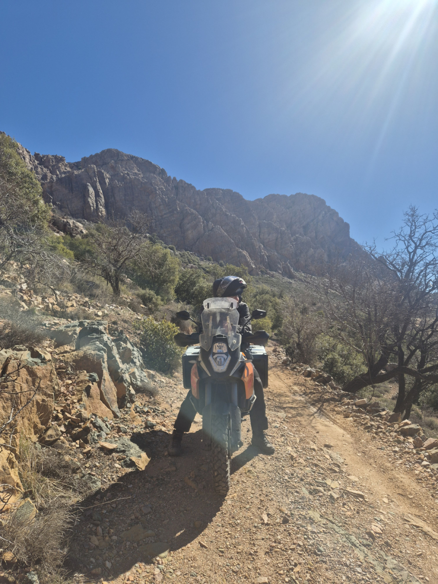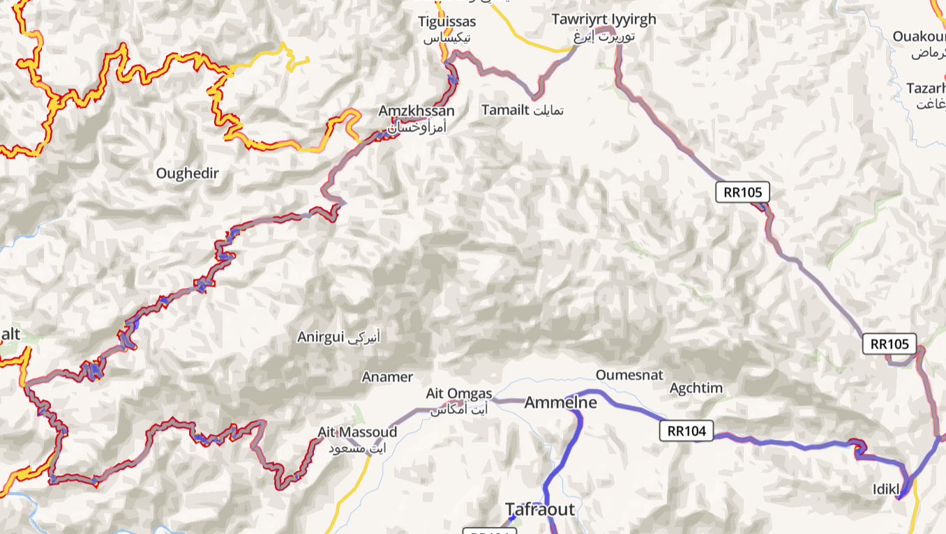 Nördlich von Tafraoute liegt ein 2.100 Meter hoher Gebirgszug (das ist der, der von der Abendsonne angestrahlt wird). Den wollen wir umfahren, auf dem Screenshot könnt ihr die Tour und den Gebirgszug gut erkennen.