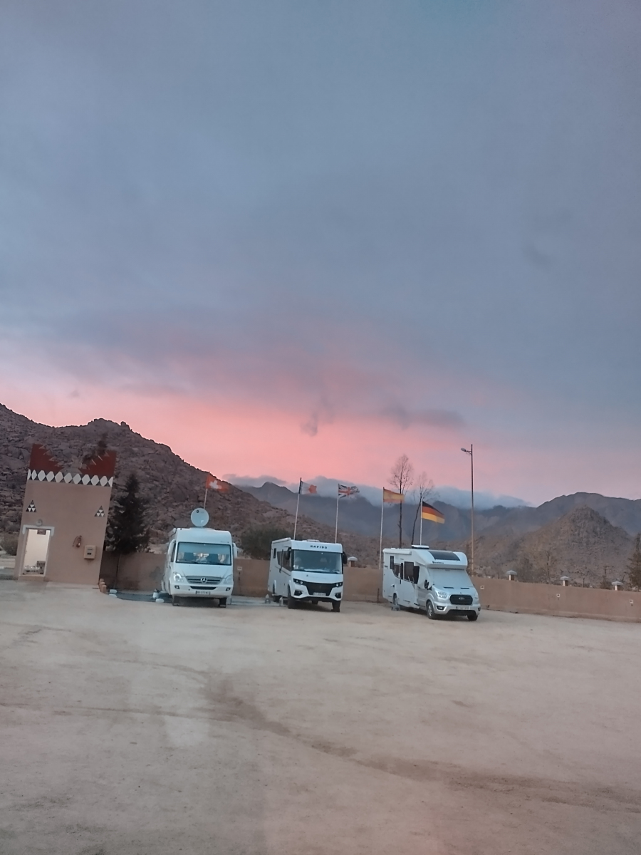 Tafraoute liegt in einem Tal auf einer Höhe von rund 1.000 Meter. Es ist umgeben von Bergen, die über 2.000 Meter hoch sind. Unser Campingplatz liegt etwas außerhalb der Stadt und ist von einer kleinen Mauer umgeben. Von hieraus haben wir schon eine geniale Aussicht auf die umliegenden Berge. Besonders der Widerschein der untergehenden Sonne taucht die Berge in wunderbare Farben.