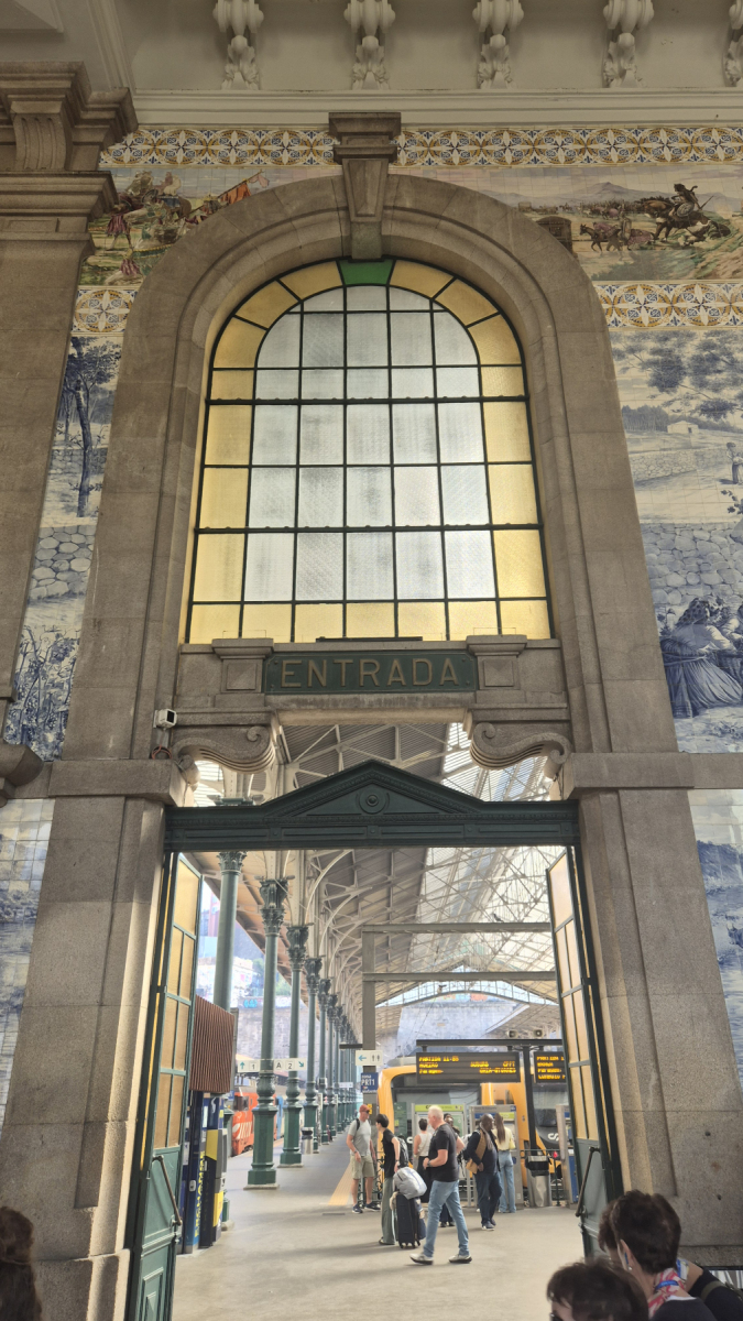 Warum der Hauptbahnhof? Portugal ist bekannt für seine Azulejos, kunstvoll gestaltete Keramikfliesen, die eine zentrale Rolle in der portugiesischen Kultur und Architektur spielen. Man sieht sie überall, entweder als Verkleidung außen an den Wänden oder als Schmuck auch innen. Der Bahnhof in Porto ist in der Vorhalle komplett damit ausgestattet: