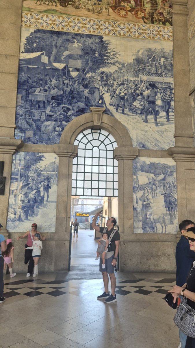 Warum der Hauptbahnhof? Portugal ist bekannt für seine Azulejos, kunstvoll gestaltete Keramikfliesen, die eine zentrale Rolle in der portugiesischen Kultur und Architektur spielen. Man sieht sie überall, entweder als Verkleidung außen an den Wänden oder als Schmuck auch innen. Der Bahnhof in Porto ist in der Vorhalle komplett damit ausgestattet: