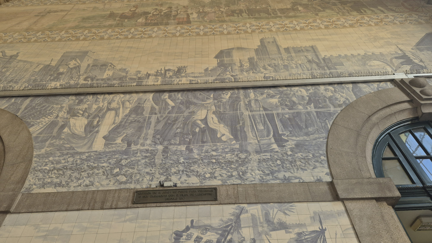Warum der Hauptbahnhof? Portugal ist bekannt für seine Azulejos, kunstvoll gestaltete Keramikfliesen, die eine zentrale Rolle in der portugiesischen Kultur und Architektur spielen. Man sieht sie überall, entweder als Verkleidung außen an den Wänden oder als Schmuck auch innen. Der Bahnhof in Porto ist in der Vorhalle komplett damit ausgestattet: