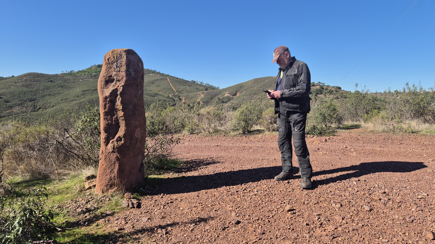 Auf der zweiten Mopedtour gab es dann wieder „alte Steine“, diesmal waren es Menhire, also prähistorische Monumente. Das sind einzelne aufrechtstehende Steine aus der Jungsteinzeit oder Bronzezeit, deren Bedeutung nicht ganz geklärt ist. In diesem Fall sind es vier Steine, die auf Hügel verteilt fast in einer Reihe stehen. Die Steine sind an einigen Stellen bearbeitet, man kann Linien und Punkte erkennen. An den Menhiren führt ein Wanderweg entlang, den wir abgegangen sind. Am Ende der Reihe hat man dann noch in Stein gehauene Gräber gefunden, die Necrópole da Pedreirinha, ebenfalls prähistorisch.