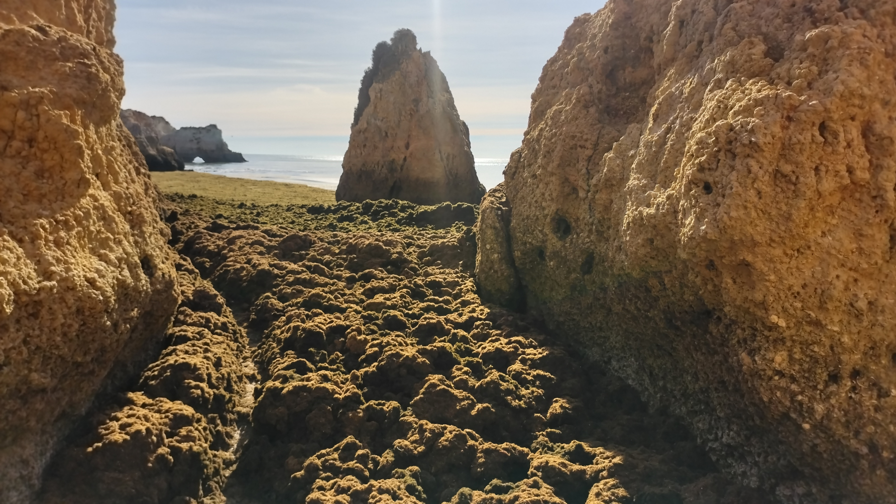 Am Strand von Alvor (unserem Campingplatz) liegen die Três Irmãos (Drei Brüder). Das sind markante Felsformationen, so wie es sie hier an der Felsküste sehr häufig gibt. Wenn Ebbe ist, werden Felsdurchgänge und Buchten freigelegt, die sonst nur mit dem Boot zu erreichen sind. Entlang der Küste gibt es einen Wanderweg, den wir teilweise gegangen sind. Dabei haben wir wirklich skurrile Dinge gesehen. Wir hoffen, dass unsere Fotos die Eindrücke halbwegs rüber bringen.