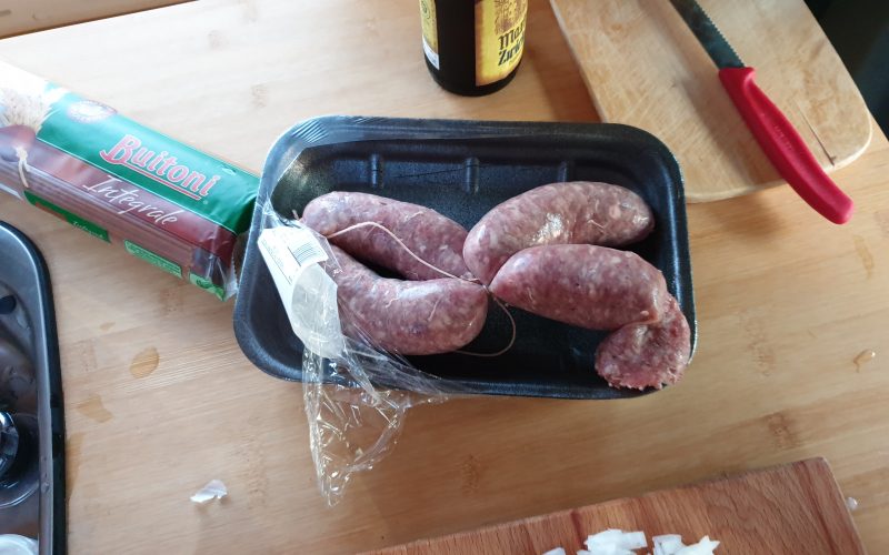 Anstatt Hackfleisch kaufe ich auch ganz gerne mal eine frische grobe Bratwurst oder in Italien eine Salsiccia. Warum? Weil mir das Hackfleisch im Regal nicht immer gefällt, speziell wenn es abgepackt ist. Und weil die Bratwurst von Hause aus schon gewürzt ist und damit der Geschmack in die Soße übergeht.