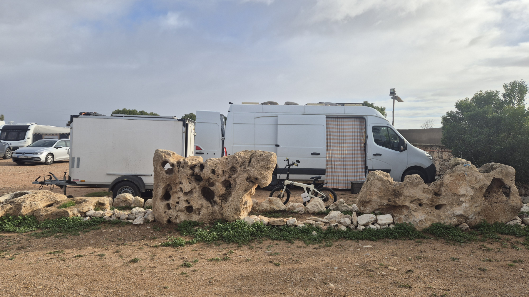 Unser Campingplatz ist nicht weit vom Strand entfernt. Überwiegend französische und englische Camper. Aber auch ein paar Niederländer und Deutsche. Viele haben sich hier für eine längere Zeit eingerichtet und ihren Platz entsprechend gestaltet. Es kommen aber auch immer wieder Camper, die nur ein zwei Nächte bleiben. Das sind dann meist junge Leute mit rudimentär eingerichteten Kastenwägen und fünf bis sechs Boards auf dem Dach. Die tauschen Wasser (Grauwasser raus und Frischwasser rein), Duschen und waschen Wäsche.