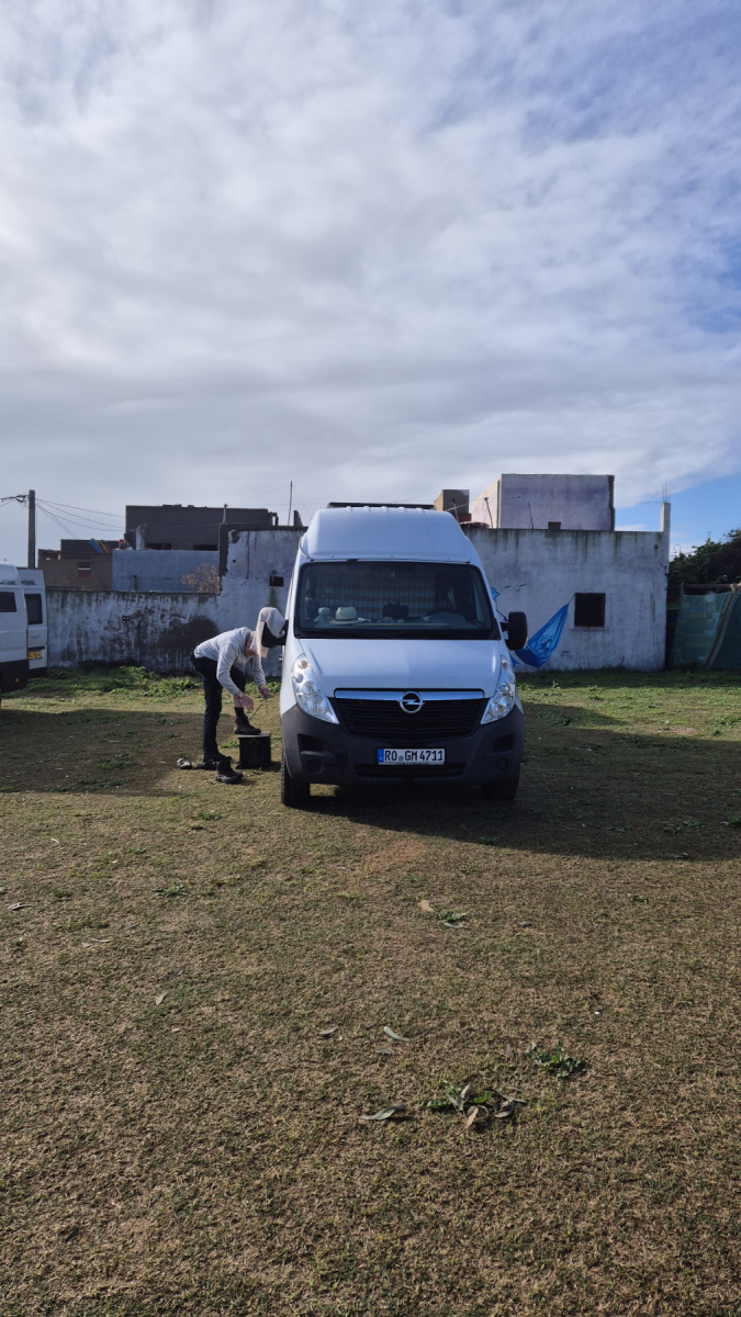 Er wird in „Park4Night“ sehr lobend erwähnt, familiengeführt, freundlich, sauber und hinter einer Düne, also Meeresnähe. Das Wetter ist immer noch nicht der Hit, oft kräftige Regenschauer, über dem Atlantik tobt sich ein Tief aus und dessen Ausläufer streift fast die gesamte Küste Marokkos. Ein Trost für uns ist, dass auch der Süden davon betroffen ist. Es macht also keinen Sinn große Strecken zu fahren. Auf dem Platz treffen wir ein deutsches Paar mit einem umgebauten Polizeibus. Die erzählen uns, dass einen Tag nach unserer Überfahrt nach Marokko, die Straße von Gibraltar mehrere Tage von starken Stürmen heimgesucht wurde. Sodass keine Fähre fahren durfte. Die Leute mussten die Tage abwarten bevor sie übersetzen konnten, wir hatten mal wieder Glück.
