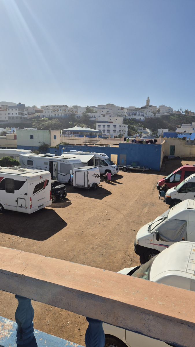 Wir sind weiter Richtung Süden unterwegs. Unser aktueller (06.01.2026) Platz ist Sidi Ifni. Ein ehemaliger spanischer Ort an der Küste. Heute ein Touristenort und Surfer-Hotspot. Es gibt drei Campingplätze und alle sind gut belegt. Wir haben Glück und bekommen einen Platz bei unserem Favoriten. Er liegt direkt am Meer, ist aber leider von einer Mauer umgeben. Es gibt aber eine Terrasse die man hochsteigen kann, von dort haben wir einen schönen Ausblick auf den Strand und Abends den Sonnenuntergang. Hier wollen wir ein paar Tage „rumhängen“, Spaziergänge am Strand und vielleicht einen Ausflug mit dem Moped machen.