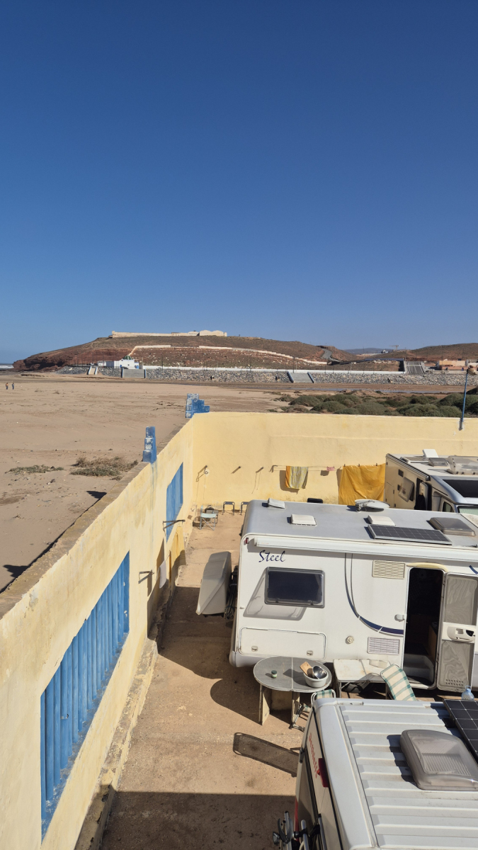 Wir sind weiter Richtung Süden unterwegs. Unser aktueller (06.01.2026) Platz ist Sidi Ifni. Ein ehemaliger spanischer Ort an der Küste. Heute ein Touristenort und Surfer-Hotspot. Es gibt drei Campingplätze und alle sind gut belegt. Wir haben Glück und bekommen einen Platz bei unserem Favoriten. Er liegt direkt am Meer, ist aber leider von einer Mauer umgeben. Es gibt aber eine Terrasse die man hochsteigen kann, von dort haben wir einen schönen Ausblick auf den Strand und Abends den Sonnenuntergang. Hier wollen wir ein paar Tage „rumhängen“, Spaziergänge am Strand und vielleicht einen Ausflug mit dem Moped machen.