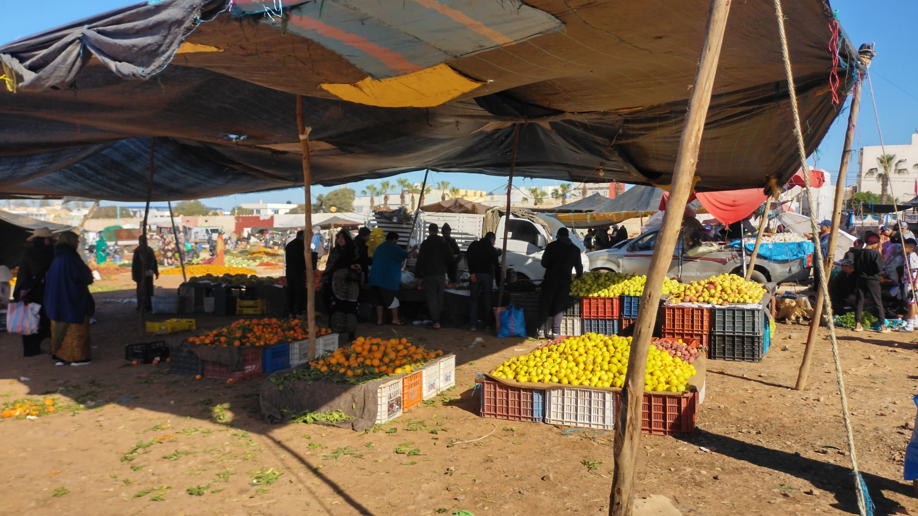 Dies wird unser erster Wochenmarkt in Marokko. Bisher haben wir „nur“ Souks gesehen (dauerhafte Marktstände in den Straßen der Städte). Das hier ist etwas völlig anderes, auf einer großen, aus festgetretenem Sandboden bestehenden Fläche werden Zelte aufgestellt. Sie erinnern an Berberzelte aus der Wüste. Ein Großteil der Waren wird auf am Boden liegende Decken ausgebreitet. Neben dem üblichen „Kram“ (ähnlich einem Flohmarkt) werden Kleidung, Haushaltswaren, Werkzeug und vor allem Obst und Gemüse angeboten. Man nimmt sich einfach eine der vielen Plastikschüsseln an einem solchen Stand und lädt Obst und Gemüse rein und geht dann zum Kassierer. Der hat eine Waage, stellt die Schüssel drauf, dann schaut er kurz auf das Display und sagt dir einen Preis. Danach schüttet er alles in eine Tüte, fertig! Bei einigen Waagen hatten wir Zweifel, dass die funktionieren, bzw. überhaupt eingeschaltet waren. Da alles sehr preiswert ist, interessiert es auch nicht wirklich. Oft verstehen wir auch den Kassierer nicht, dann geben wir ihm einen 50 Dirham-Schein (5 Euro) und er gibt uns das Wechselgeld raus.