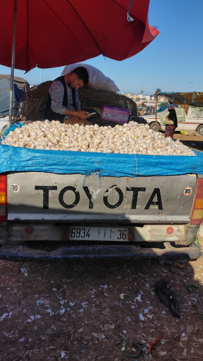 Dies wird unser erster Wochenmarkt in Marokko. Bisher haben wir „nur“ Souks gesehen (dauerhafte Marktstände in den Straßen der Städte). Das hier ist etwas völlig anderes, auf einer großen, aus festgetretenem Sandboden bestehenden Fläche werden Zelte aufgestellt. Sie erinnern an Berberzelte aus der Wüste. Ein Großteil der Waren wird auf am Boden liegende Decken ausgebreitet. Neben dem üblichen „Kram“ (ähnlich einem Flohmarkt) werden Kleidung, Haushaltswaren, Werkzeug und vor allem Obst und Gemüse angeboten. Man nimmt sich einfach eine der vielen Plastikschüsseln an einem solchen Stand und lädt Obst und Gemüse rein und geht dann zum Kassierer. Der hat eine Waage, stellt die Schüssel drauf, dann schaut er kurz auf das Display und sagt dir einen Preis. Danach schüttet er alles in eine Tüte, fertig! Bei einigen Waagen hatten wir Zweifel, dass die funktionieren, bzw. überhaupt eingeschaltet waren. Da alles sehr preiswert ist, interessiert es auch nicht wirklich. Oft verstehen wir auch den Kassierer nicht, dann geben wir ihm einen 50 Dirham-Schein (5 Euro) und er gibt uns das Wechselgeld raus.
