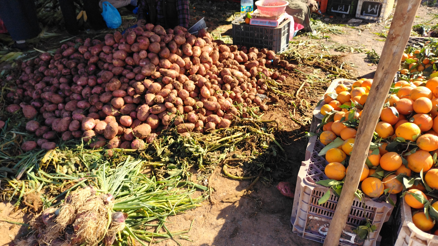 Dies wird unser erster Wochenmarkt in Marokko. Bisher haben wir „nur“ Souks gesehen (dauerhafte Marktstände in den Straßen der Städte). Das hier ist etwas völlig anderes, auf einer großen, aus festgetretenem Sandboden bestehenden Fläche werden Zelte aufgestellt. Sie erinnern an Berberzelte aus der Wüste. Ein Großteil der Waren wird auf am Boden liegende Decken ausgebreitet. Neben dem üblichen „Kram“ (ähnlich einem Flohmarkt) werden Kleidung, Haushaltswaren, Werkzeug und vor allem Obst und Gemüse angeboten. Man nimmt sich einfach eine der vielen Plastikschüsseln an einem solchen Stand und lädt Obst und Gemüse rein und geht dann zum Kassierer. Der hat eine Waage, stellt die Schüssel drauf, dann schaut er kurz auf das Display und sagt dir einen Preis. Danach schüttet er alles in eine Tüte, fertig! Bei einigen Waagen hatten wir Zweifel, dass die funktionieren, bzw. überhaupt eingeschaltet waren. Da alles sehr preiswert ist, interessiert es auch nicht wirklich. Oft verstehen wir auch den Kassierer nicht, dann geben wir ihm einen 50 Dirham-Schein (5 Euro) und er gibt uns das Wechselgeld raus.