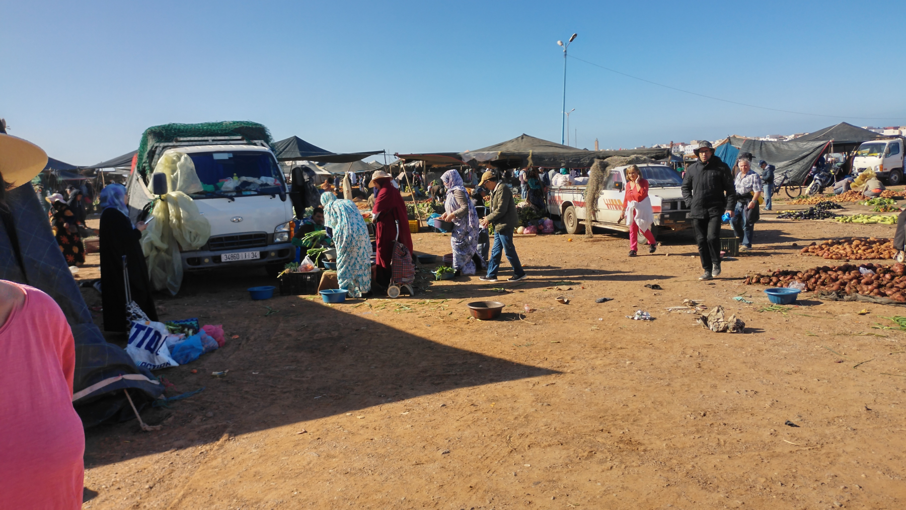 Dies wird unser erster Wochenmarkt in Marokko. Bisher haben wir „nur“ Souks gesehen (dauerhafte Marktstände in den Straßen der Städte). Das hier ist etwas völlig anderes, auf einer großen, aus festgetretenem Sandboden bestehenden Fläche werden Zelte aufgestellt. Sie erinnern an Berberzelte aus der Wüste. Ein Großteil der Waren wird auf am Boden liegende Decken ausgebreitet. Neben dem üblichen „Kram“ (ähnlich einem Flohmarkt) werden Kleidung, Haushaltswaren, Werkzeug und vor allem Obst und Gemüse angeboten. Man nimmt sich einfach eine der vielen Plastikschüsseln an einem solchen Stand und lädt Obst und Gemüse rein und geht dann zum Kassierer. Der hat eine Waage, stellt die Schüssel drauf, dann schaut er kurz auf das Display und sagt dir einen Preis. Danach schüttet er alles in eine Tüte, fertig! Bei einigen Waagen hatten wir Zweifel, dass die funktionieren, bzw. überhaupt eingeschaltet waren. Da alles sehr preiswert ist, interessiert es auch nicht wirklich. Oft verstehen wir auch den Kassierer nicht, dann geben wir ihm einen 50 Dirham-Schein (5 Euro) und er gibt uns das Wechselgeld raus.