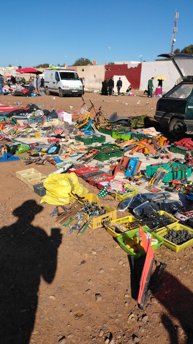 Dies wird unser erster Wochenmarkt in Marokko. Bisher haben wir „nur“ Souks gesehen (dauerhafte Marktstände in den Straßen der Städte). Das hier ist etwas völlig anderes, auf einer großen, aus festgetretenem Sandboden bestehenden Fläche werden Zelte aufgestellt. Sie erinnern an Berberzelte aus der Wüste. Ein Großteil der Waren wird auf am Boden liegende Decken ausgebreitet. Neben dem üblichen „Kram“ (ähnlich einem Flohmarkt) werden Kleidung, Haushaltswaren, Werkzeug und vor allem Obst und Gemüse angeboten. Man nimmt sich einfach eine der vielen Plastikschüsseln an einem solchen Stand und lädt Obst und Gemüse rein und geht dann zum Kassierer. Der hat eine Waage, stellt die Schüssel drauf, dann schaut er kurz auf das Display und sagt dir einen Preis. Danach schüttet er alles in eine Tüte, fertig! Bei einigen Waagen hatten wir Zweifel, dass die funktionieren, bzw. überhaupt eingeschaltet waren. Da alles sehr preiswert ist, interessiert es auch nicht wirklich. Oft verstehen wir auch den Kassierer nicht, dann geben wir ihm einen 50 Dirham-Schein (5 Euro) und er gibt uns das Wechselgeld raus.